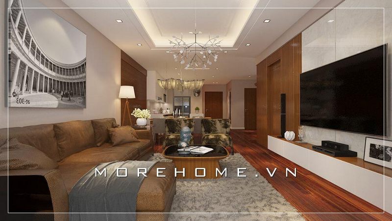 Bàn ghế sofa phòng khách có thiết kế hiện đại kết hợp với bàn trà tạo nên sự hài hòa trong không gian của căn phòng, gây ấn tượng rất tốt.
